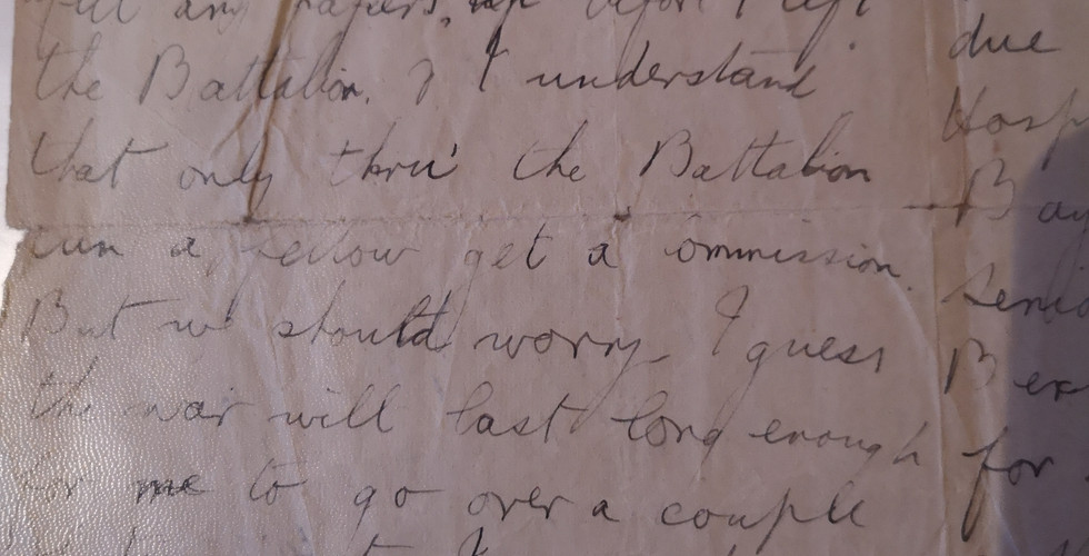 Don’t forget to make the most of your stay in Hospital its the only place you don’t have to form fours Etc. Quite a large draft, 450 all ranks went to the 18th last Thursday. Q.M. Vivian sent over as escort to Etaples. The 4th Res. now reinforces the 1st 18 & 47 Battalions also the 2nd Pioneers so I guess they will need all the 4000 men I hear they have up their. I will probably be up in the Reserve in a couple of weeks. It does not seem so bad their as it used to be, for Casuality Officers fun most of the Companies. I see on Order that Sgt. McGanly is due here this week from Hospital furlough. Sgt. Bayliss is taking the seniors N.C.O. course at Bexhill, two months it lasts for. Lt J. Spriers is supposed to report to the Reserve here this week. As regards me going to Bexhill for that commission business, I guess I shall have to wait till I go to France again for as you know, I did not fill any papers up before I left the Battalion & I understand that only thru the Battalion can a fellow get a commission. But we should worry, I guess the war will last long enough for me to go over a couple of times yet. I see that Sgt. Harper, Cpl. Mandy, Pte. Sullivan, got the Military Medal, also that Sgt. McGanly & myself where awarded a “Bar” to the M.M. I believe S.M. Campbell is figuring on getting his discharged at the Medical Board. Some people sure have lucky mids. By the nature of your wounds I can see a trip to Canada for you, I sure wish you the best of luck. I guess in about umpteen years more time we will get back to Canada. Don’t forget any time you have a few moments to spare to let us know how you are getting along.
