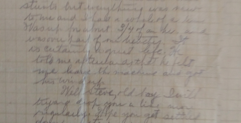 Another extremely entertaining part of this letter is his description of his first flight in an airplane. The pilot seemed to be having some fun with him while showing him some tricks of the trade. It doesn't seem like that flight really dampened his spirits on flying, as in this letter he mentions that he is still trying to figure out whether or not he wants to join the R.A.F., which he seems to have been mulling over for the last three or four letters.
